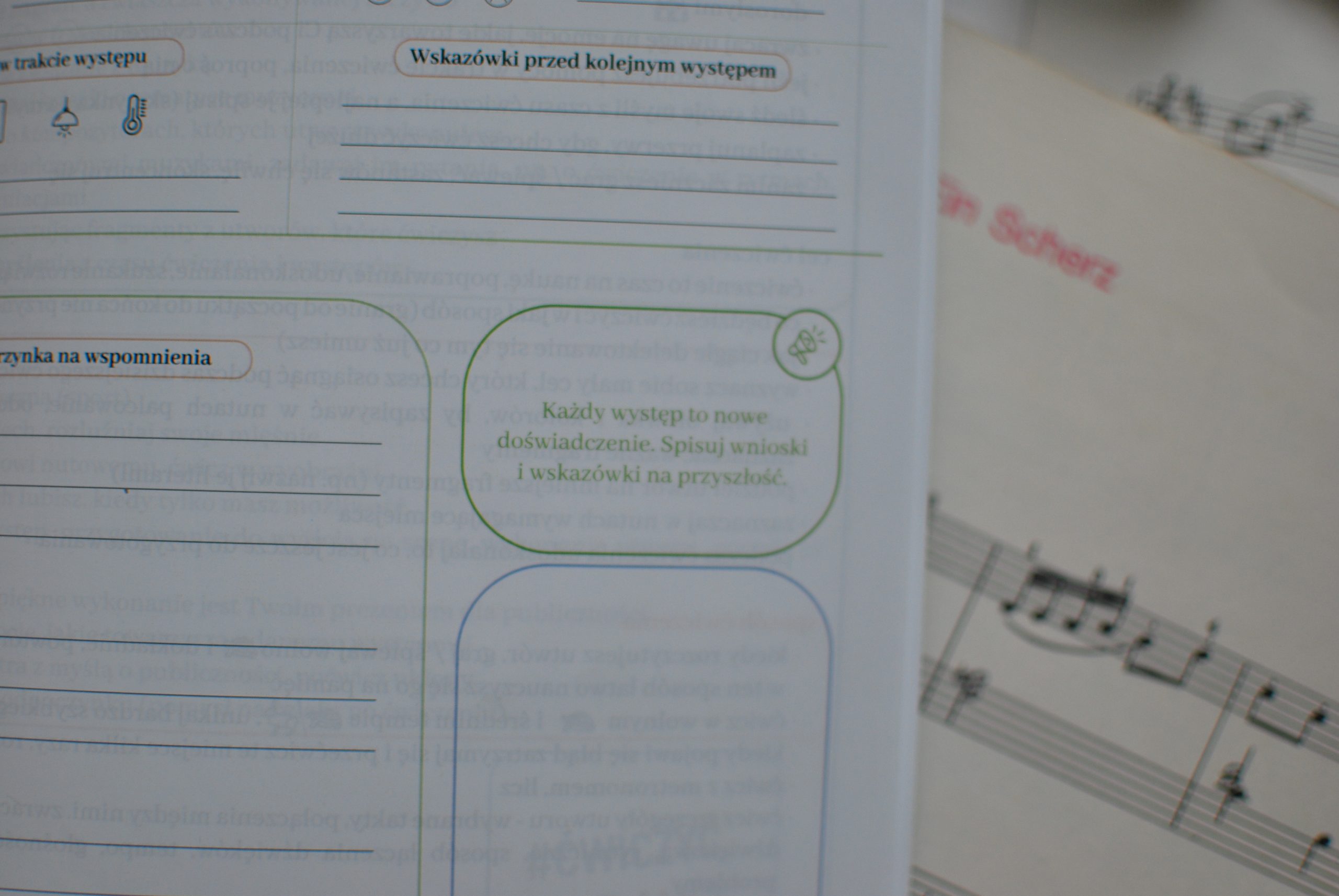 Młody muzyk ma możliwość dokumentowania czasu ćwiczenia i występów w ramach Muzycznych Odkryć i Scenicznych Wspomnień. Wewnątrz pamiętnika znajdzie także tajemnicze Skrzynki na myśli oraz puste okienka. Rysując w tych okienkach scenki muzyczne, stworzy wyjątkową rysunkową animację. W przygotowaniu do występu oraz codziennym ćwiczeniu pomocne będą z pewnością, zamieszczone na ostatnich stronach pamiętnika, Wskazówki – jak ćwiczyć?